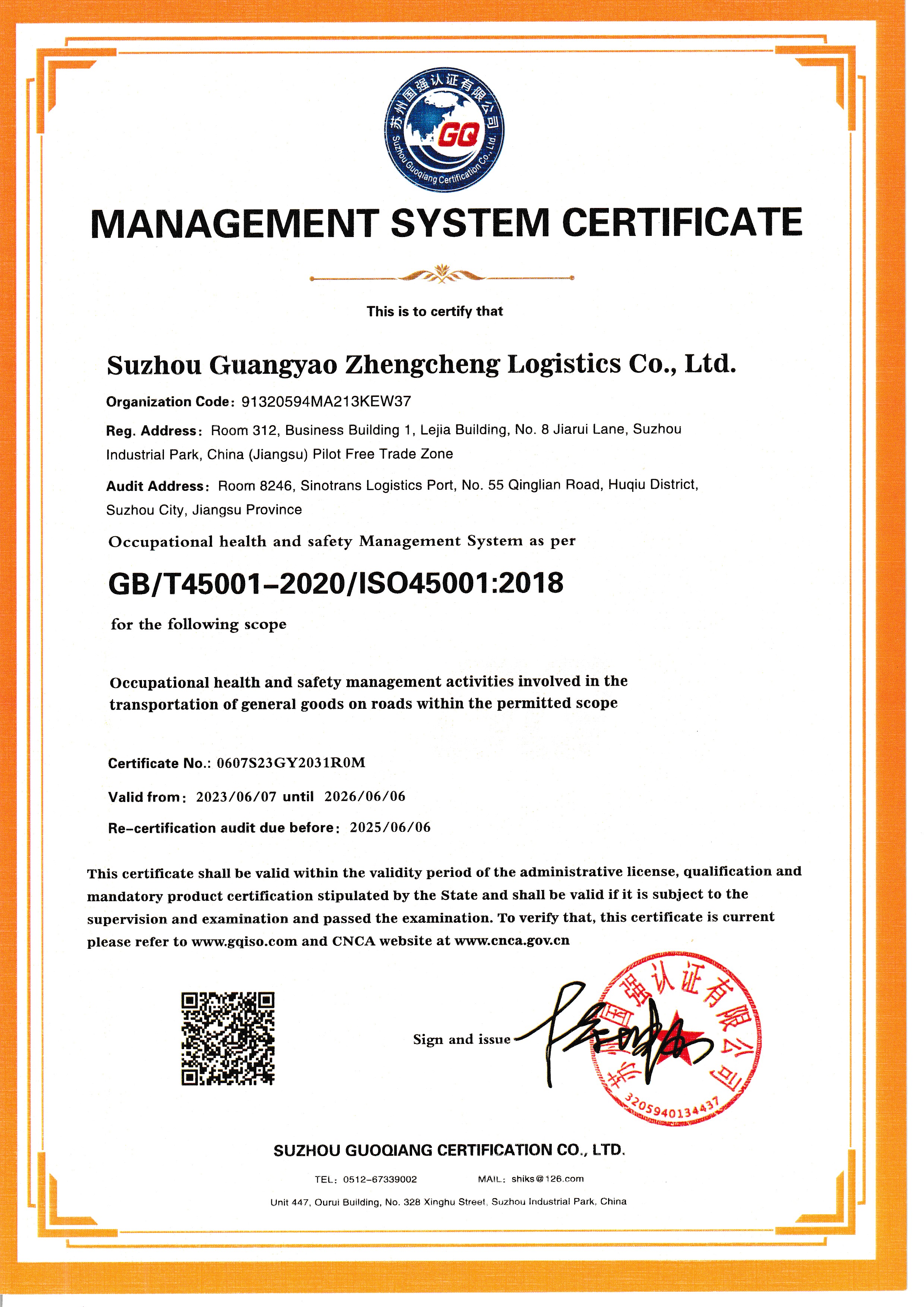 广耀政成物流公司一直秉承以客户为中心的理念,并致力于不断提升服务质量。近日,公司荣获ISO45001和ISO14001双项体系认证,为公司的卓越管理质量和服务水平再次添彩。